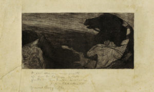 Acquaforte. mm 110x220. Foglio: mm 230x330. Iscritta dall'artista a matita in basso a destra: "A voi che mi insegnaste gli eroi di Vagner (sic) questo frutto di un mio desiderio eroico / Edoardo De Albertis Genova maggio 1900". Rarissima incisione simbolista eseguita dall'artista genovese, noto soprattutto come scultore. Provenienza: Galleria Emporio Floreale, Roma. Unico esemplare finora noto, pubblicato in Scultori e incisione 1900-1940, a cura di Alfonso Panzetta e Francesco Parisi, catalogo della mostra (Montevarchi), Firenze 2015, p. 53 e Liberty in Italia. Artisti alla ricerca del moderno, a cura di Francesco Parisi e Anna Villari, catalogo della mostra (Reggio Emilia), Cinisello Balsamo 2016, n. 211, p. 205 e n. 126, p. 272 (scheda di Gabriella Bocconi). (1) Difetti e strappetti ai margini di cui uno più ampio rincollato che interessa anche una piccola parte di inciso. Montata in passe-partout.