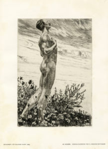 Acquaforte. mm 230x180. 330x240. Da "Zeitschrift für Bildende Kunst", 1904. Scritte tipografiche in basso. L'incisione raffigura un nudo maschile che incede nella natura, proteso verso l'alba radiosa di un rinnovamento dei sensi e dello spirito. Il volto denota una verosimile somiglianza con quello di Friedrich Nietzsche e il soggetto si inserisce nelle iconografie naturiste tipiche della Lebensreform. SI AGGIUNGE: Max Roeder, Heiliger Hain. Acquaforte. mm 215x270. Foglio: mm. 250x340. Da "Zeitschrift für Bildende Kunst", N. F. XXIII. Heft 12. Titolo e scritte tipografiche in basso. il tema del Deutsch-Römer Max Roeder è ispirato alla natura del paesaggio italico nella sua essenza primordiale e mitologica, nel quale incantarsi malinconicamente di fronte ai boschetti sacri, alle rovine allusive a un passato lontano ed eroico, rievocato da erme solitarie, ninfei abbandonati, giardini di ville rinascimentali immersi nel silenzio dei cipressi e dei pini. (2) Ottima conservazione. La seconda opera reca velina protettiva.
