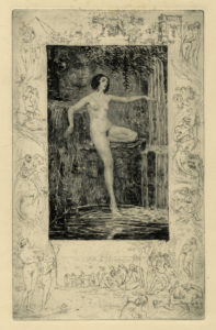 Acquaforte. mm 260x170. Foglio: mm 350x250. Il soggetto principale è incorniciato interamente da remarque con figure maschili e femminili in amore e idilli naturisti inneggianti alla riforma della vita. Rara. SI AGGIUNGE: Idem. Gigante della montagna. Xilografia. mm 200x159. foglio: mm 350x250. Firmata nella matrice in basso a sinistra e a matita in basso a destra. (2) Opera 1: piccoli residui di adesivo ai lati del foglio, altrimenti ottima conservazione.