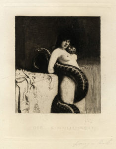 Acquaforte. mm 214x170. Foglio: mm 520x375. Firmata sulla lastra al centro verso sinistra e a matita in basso a destra. Titolo inciso in basso al centro. Dell'acquaforte esiste un dipinto analogo dal quale si svilupperanno le varie versioni del celeberrimo dipinto scandalo Die Sünde. Cfr. Franz von Stuck. Lucifero moderno, a cura di S. Marinelli e A. Tiddia, catalogo della mostra al Mart di Trento, Ginevra-Milano 2006, ill. p. 66, cat. n. 32. (1) Bellissima impressioni e grandi margini intonsi. Ottima conservazione.