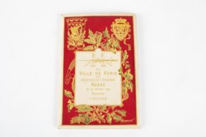 PORTE-DOCUMENTS en velin blanc : Porte-documents en velin blanc avec plat en maroquin rouge. Premier plat aux armes de la ville de Paris avec décor floral encadrant le titre : "La Ville de Paris aux officiers de l'Escadre Russe le 19 octobre 1893...