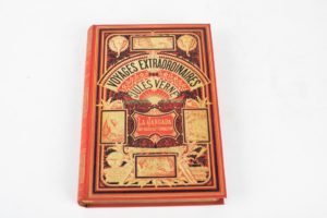 VERNE Jules : La jangada. Paris, Hetzel, 1881. 1 volume grand in-8°, cartonnage éditeurs aux deux éléphants, pleine percaline rouge, toutes tranches dorées, gardes bleues, catalogue AP nouveautés pour 1882 in-fine.