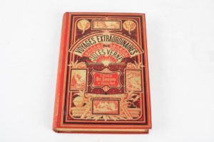 VERNE Jules : L'école des Robinsons - le rayon vert. Paris, Hetzel, 1882. 1 volume grand in-8°, cartonnage éditeurs aux deux éléphants, pleine percaline rouge, toutes tranches dorées, gardes bleues.