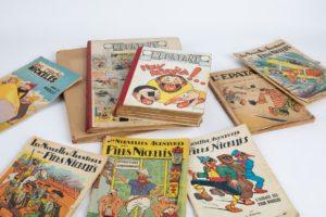 – Ensemble de 3 reliures éditeur : Album relié des numéros 39 (26 mai 1938) à 60 (20 octobre 1938) format 26x38 cm environ (reliure fragile, bas du dos fendu sinon bon état général), album des numéros 61 (27 août 1938) à 96 (29 juin 1939) format 20x26cm environ (léger défaut de reliure entre les numéros 61 et 62 sinon très bon état général) et album broché (petit format, couverture papier, état moyen) des numéros 97 (6 novembre 1939) à 104 (24 août 1939, dernier numéro avant guerre) – On joint 5 bandes dessinées des Pieds Nickelés (albums brochés en mauvais état général) ainsi que le premier tome de L’Histoire de France de Gautherot aux éditions Maison de la Bonne Presse (bon état)