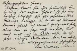 LOU ANDREAS-SALOMÉ. — Louise von Salomé dite (1861-1937). — CARTE AUTOGRAPHE SIGNÉE, Göttingen, 14 février 1905. — 1 p. in-8 oblong. — En allemand.