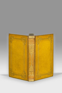 maroquin citron à long grain, larges fleurons d’angle reliés par des jeux de filets, dos lisse orné de filets et fleurons dorés, triple filet intérieur, tranches dorées, étui (Reliure de l’époque).