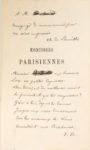 A M. [nom rayé]/témoignage de reconnaissance pour/ses soins empressés/Th. De Banville/Monsieur [nom rayé] aux humains/Livre ces petites Esquisses :/Mon livre, en de meilleures mains. Se pouvait-il que tu naquisses ?/Grâce à lui, depuis le Taunus/Jusques aux mers tunisiennes/Tous les amoureux de Vénus /