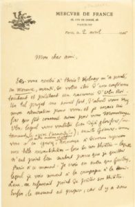 Lettre autographe signée de 2 pages in-8, sur double feuillet à en-tête du Mercure de France.