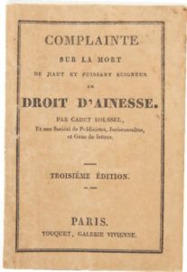 [Gérard de NERVAL, Félix BODIN]. Complainte sur la mort de haut et puissant seigneur le droit d'ainesse, par Cadet Roussel et une société de publicistes, jurisconsultes, et gens de lettres. Troisième édition. Paris, Touquet, sans date [1826].