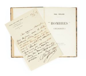 On joint une lettre autographe signée de l'éditeur Albert Messein à Mr Champion. 17 juillet (?) 1909. 1 page in-8. Lettre d'accompagnement pour un exemplaire d'Hombres, Verlaine posthume et des fumés. Il annonce également que l'édition de Femmes est épuisée.
