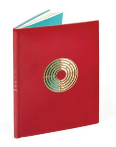 In-12, veau glacé rouge, dos lisse, plat supérieur ajouré avec grille en plastique doré, doublures et gardes de box bleu ciel, tranches dorées sur témoins, couverture et dos conservés, chemise-étui (Leroux, 1970).