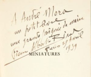 A André Mora/un petit livre/une grande poignée de main/Pierre Albert-Birot/Paris 25 avril 1939.