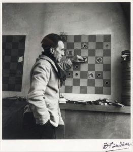 Fameux portait de Marcel Duchamp de profil dans son atelier, devant un échiquier mural.