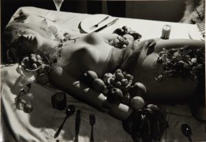 Denise BELLON. Mannequin allongé sur une table avec fruits. Tirage argentique [21 x 30,5 cm], …
