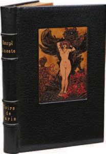 Raoul Gineste. Soirs de Paris. Paris, Beraldi, 1903. In-8, maroquin bleu nuit, plaque incisée sur le premier plat représentant une femme nue dans un décor de festivités parisiennes, dos à 4 nerfs, encadrement intérieur du même maroquin avec