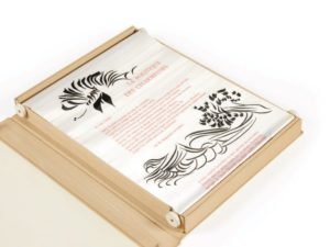 Livre imprimé à la manière des rouleaux chinois, sur rayonne, le texte en rouge et les gravures en noir. Fixé aux extrémités sur deux bâtonnets.
