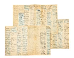 3 manuscrits sur 3 pages in-folio, oblongues, formées de 6 feuillets de papier quadrillé réunis par onglets, pliés en accordéon et présentant 8 colonnes, à l'encre noire, bleue ou au crayon. Le texte de chaque scripteur occupe une colonne entière puis quelques lignes de la suivante.
