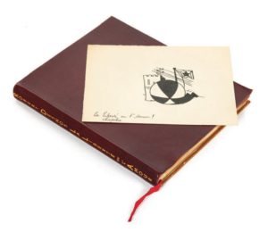 On joint : deux dessins originaux à l'encre de Chine sur un feuillet de papier japon fort : l'un figurant un ballon avec une tour et un drapeau est légendé ; “La Liberté ou l'Amour ! chapitre.”