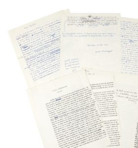 On joint la dactylographie avec quelques corrections autographes du texte, ainsi que trois versions, dactylographiées ou en copies carbone, d'un complément à insérer, daté de Vence, 1er septembre 1961, avec proposition de trois titres au choix Faustroll seul pôle, Le pôle du milieu, Faustroll pôle du milieu. Et une note autographe signée J. D. du 2 septembre 61.