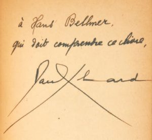 Bel envoi autographe sur le feuillet préliminaire : à Hans Bellmer, / qui doit comprendre ce livre. / Paul Eluard.”