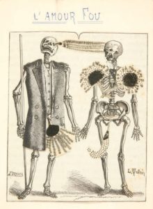Beau collage original de Jane Graverol à partir d'un bois gravé montrant deux squelettes.