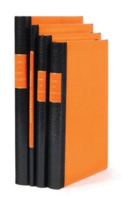 Plaquette in-8, demi-maroquin noir à petits coins, dos lisse, pièce de titre de veau brique, plats, doublures et gardes de papier ciré brique, non rogné, tête dorée, couvertures de papier noir illustrés et dos conservés, étui (D.-H. Mercher).