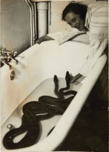 Curieuse image montrant deux serpents dans une baignoire, une femme les caressant : il s'agit sans doute de Mademoiselle Dorita charmeuse de serpents qui a notamment été photographiée en 1930 par Man Ray pour une fameuse couverture du magazine Vu.