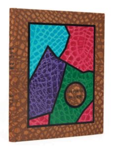 In-8 carré, peau brune traitée façon crocodile, dos lisse, décor mosaïqué au centre des plats de même peau teintée en violet, vert, bleu et rouge, serties de listels de box noir, non rogné, couvertures et dos conservés, étui (Leroux, 1972).