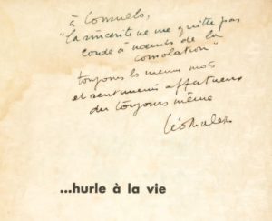 Un des deux exemplaires de tête nominatifs sur japon nacré, celui-ci pour Consuelo de Saint-Exupéry, enrichi d'un envoi autographe signé : à Consuelo, / « la sincérité ne me quitte pas / corde à noeuds de la / consolation » / toujours les mêmes mots / et sentiments affectueux / du toujours même / Léo Malet Peintre et sculptrice d'origine salvadorienne, veuve en 1927, Consuelo de Saint-Exupéry née
