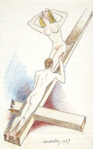 Dessin original à l'encre et aux crayons de couleurs figurant un couple nu sur une croix brisée.