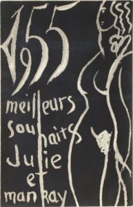 Très amusante carte de voeux photographique pour l'année 1955 : il reproduit un dessin figurant une femme avec “les meilleurs souhaits Julie et Man Ray”.