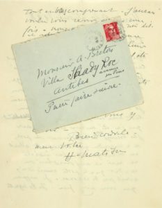 Lettre autographe signée “H. Matisse”, 2 pages in-4, enveloppe conservée, adresse “Villa Shady Roc, avenue des Pins, Antibes”.