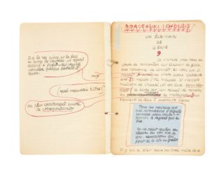 Beau manuscrit autographe à l'encre brune et rouge sur papier quadrillé avec nombreux papillons de papier bleu collés.