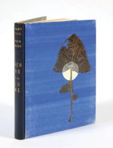 In-12, demi-maroquin bleu nuit à la Bradel, plats de papier peint en bleu, sur le premier, décor floral mosaïqué fait d'une feuille verte vernie et de deux morceaux de verre formant un rond, entièrement non rogné, couvertures et dos conservés, étui (Mercher, 1969).