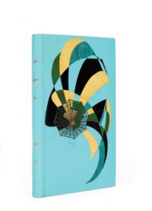 In-8 étroit, box bleu ciel, dos lisse, décor mosaïqué et en relief en plusieurs tons sur les plats, doublures et gardes de daim bleu, non rogné, tête dorée, couverture et dos conservés, chemise, étui (Monique Mathieu, 1969).