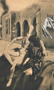 Réalisé à l'aide de photographies découpées de magazines, il figure une jeune femme assise auprès d'un mannequin en bois qui lui passe le bars autour du cou.