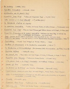 Y figurent les tracts, les catalogues d'exposition ou les cartons d'invitation avec le titre, le nom des auteurs et, entre parenthèses, la date de publication. A la fin, une quarante-et-unième ligne décrit le “papier à lettre de Paul Eluard”. Cette liste correspond sans doute à un recueil de publications et d'ephemera que Valançay avait constitué.