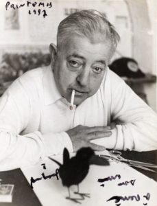 Grand et beau portrait photographique de Jacques Prévert, fumant, avec un oiseau devant lui.