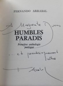 Envoi autographe signé : «A Marguerite Duras HUMBLES PARADIS... et paradisiaquement vôtre, F. Arrabal».