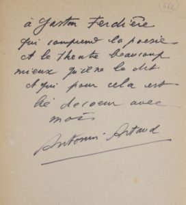 Envoi autographe signé : «à Gaston Ferdière qui comprend la poésie et le théâtre beaucoup mieux qu'il ne le dit et qui pour cela est lié de cœur avec moi, Antonin Artaud».