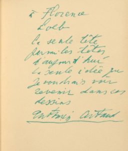Envoi autographe signé : «à Florence Loeb, la seule tête parmi les têtes d'aujourd'hui, la seule idée que je voudrais voir revenir dans ces dessins, Antonin Artaud».