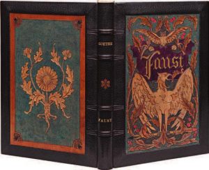 Jean Wolgang Goethe. Faust. Paris, Quantin, 1880. In-4, maroquin ébène, plaques incisées sur les plats, la première représentant un aigle aux ailes déployées, le corps mi-femme mi-oiseau, dans un décor de branches de houx, dans la partie