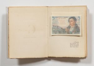 Avec le billet de 5 francs et la légende imprimée dessus : «Et puis voici mon cœur qui ne bat que pour vous».