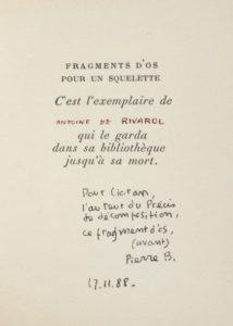 Exemplaire de Cioran portant cet envoi autographe signé : «Pour Cioran, l'auteur du Précis de décomposition, ce fragment d'os (avant) Pierre B, 17 nov 88».