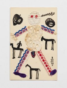 CAHUN Claude et MALHERBE Suzanne. Carte postale joliment brodée avec collage et dessins, signée …