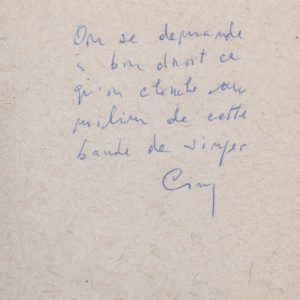 Tirage unique à 45 exemplaires numérotés sur papier de jute du Rajasthan, chacun rehaussé de 3 peintures tantriques originales, signés au colophon par Cioran, celui-ci annoté en page de garde : «On se demande à bon droit ce qu'on cherche au milieu de cette bande de singes, Cioran».