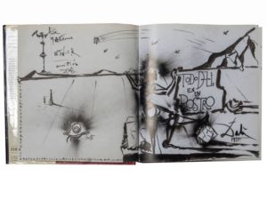 Dédicacé «pour Madame Lenoir amitiés Dali» illustré d'un superbe dessin, à l'encre de chine sur double page daté 1975 et signé par Salvador Dali.