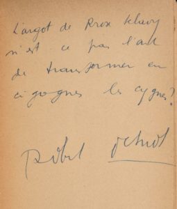 Envoi autographe signé : «L'argot de RRose Sélavy n'est-ce pas l'art de transformer en cigognes les cygnes? Robert Desnos».