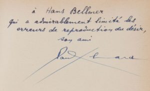 Exemplaire d'Hans Bellmer portant cet envoi autographe signé : «A Hans Bellmer, qui a admirablement limité les erreurs de reproduction du désir, son ami Paul Eluard».