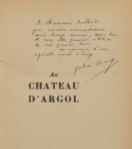 Envoi autographe signé : «A Monsieur Alberts, pour renouer connaissance après douze années, avec lui et avec cette première édition de mon premier livre, en souvenir d'une agréable soirée à Liège, Julien Gracq».